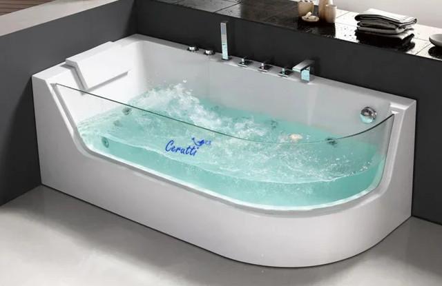 Изящная гидромассажная акриловая ванна (джакузи) с большим стеклянным экраном ванна смотрится шикарно и современно.